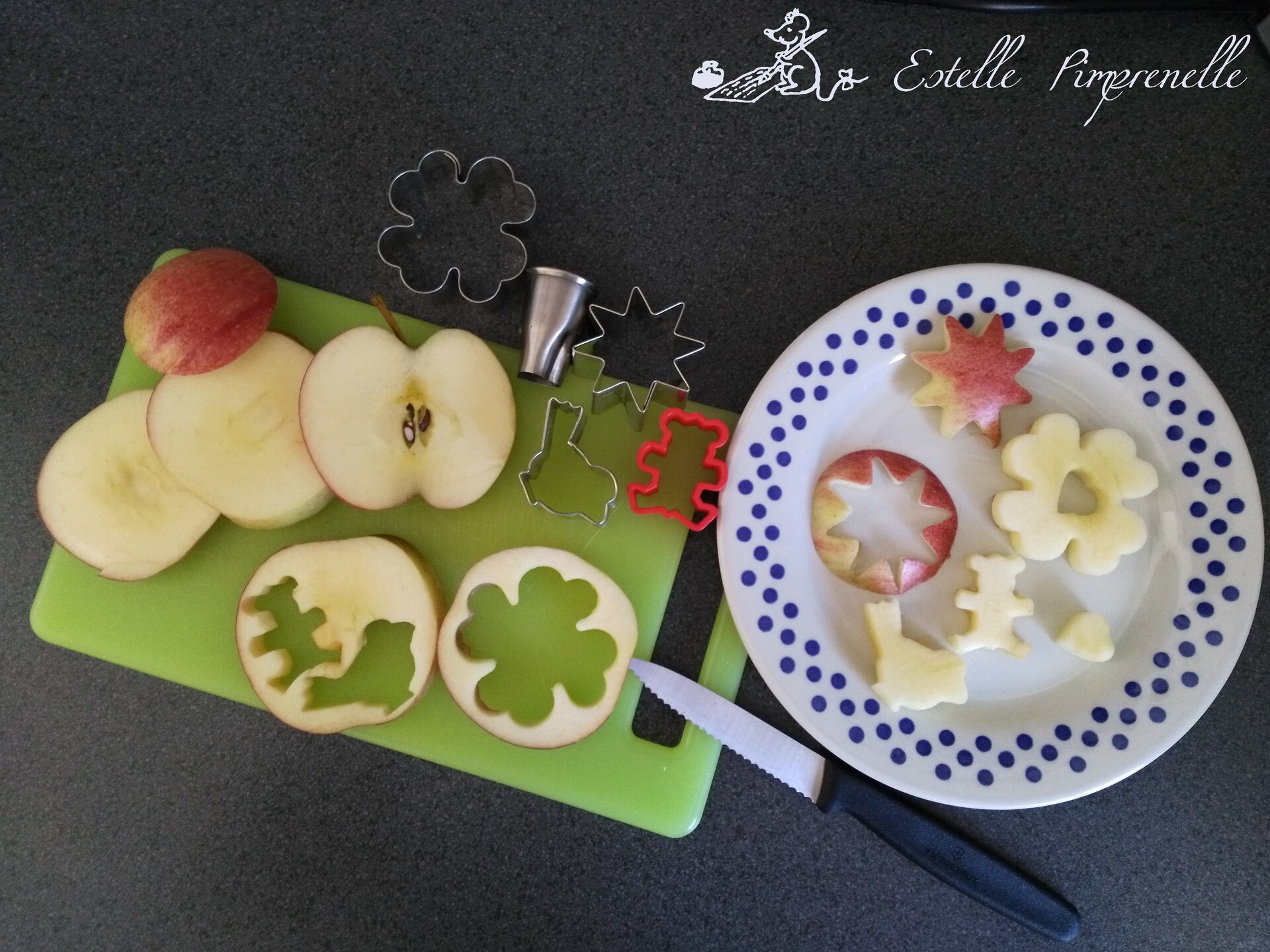 Kleine Apfelstücke bleiben um die geschnittenen Formen herum liegen. Wenn niemand sie essen will, können sie in einem Obstsalat, Joghurt oder einem Müsli verwendet werden.